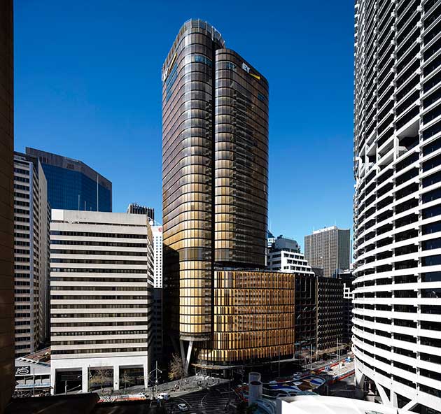 L´EY Centre di Sidney. Il particolare sistema Permasteelisa di facciata a doppia pelle con frangisole in legno incorporati dà un aspetto ´legno´ all´intera facciata dell´edificio (foto Mirvac FJMT – Ph. Brett Boardman Photography, courtesy Permasteelisa) |