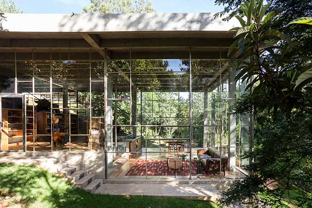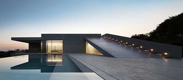 Casa Bibliotecais a Vinhedo (Sao Paulo), committente João Carlos, architetto Atelier Branco Arquitetura). Il progetto, situato in cima a un ripido terreno, è un un luogo immerso nella densa vegetazione della ‘mata atlantica’, lontano dal caos della città, dove poter leggere e riflettere. La forma è generata dalla relazione tra la linea del terreno, modificato per formare terrazzamenti orizzontali, e quella del tetto in cemento, il primo elemento visibile avvicinandosi alla casa.