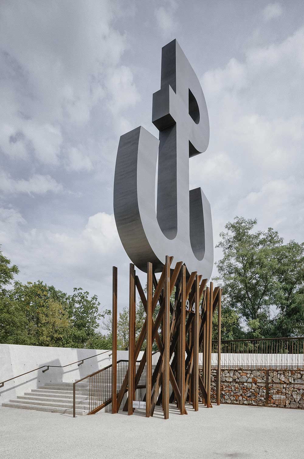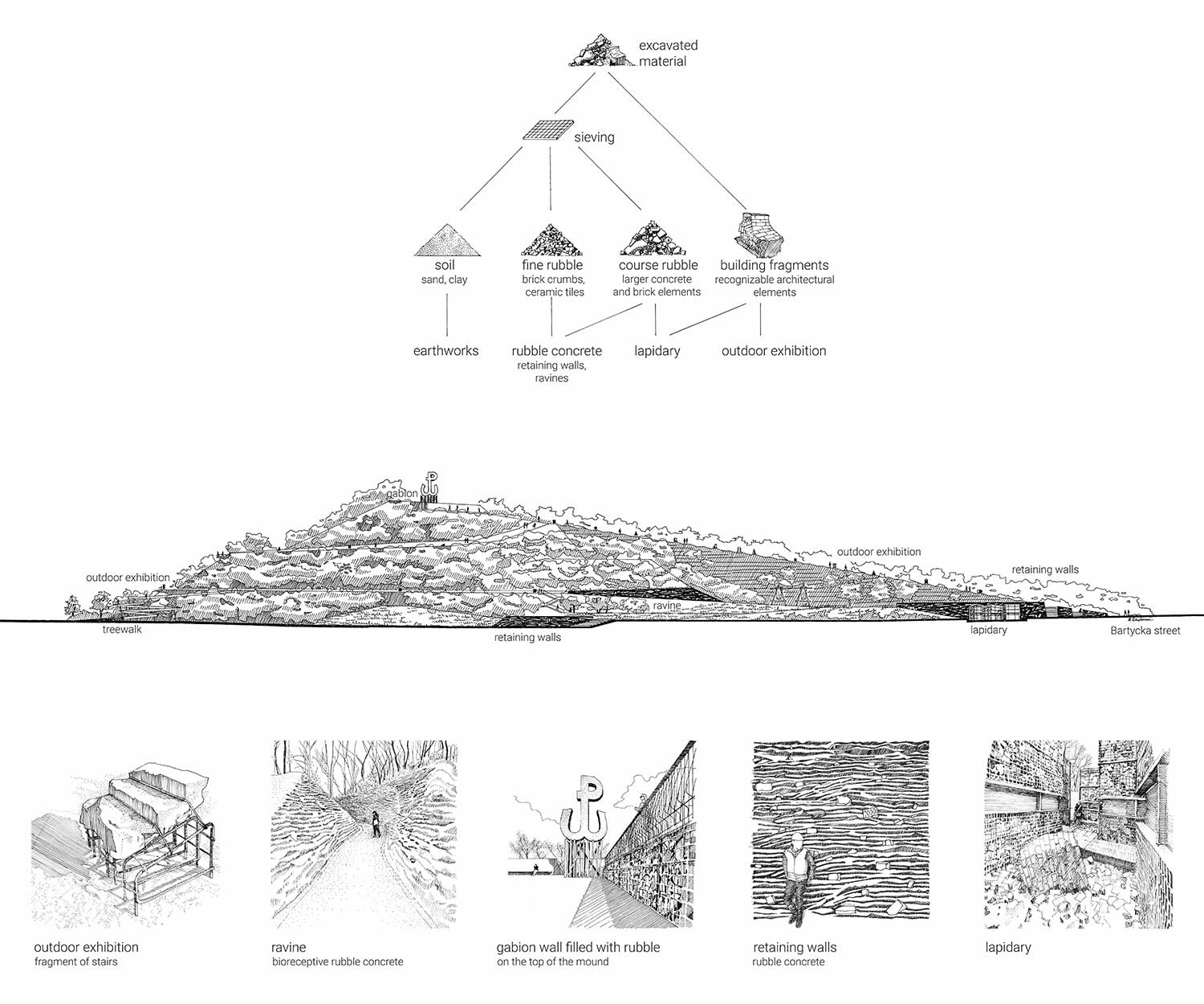 Per rendere accessibile il sito, la complessità del terreno ha portato alla costruzione di ponticelli pedonali sospesi e allo scavo di ‘canyon’ artificiali i cui fianchi sembrano strati geologici di una collina antropomorfa, a memoria dello sforzo manuale di migliaia di cittadini e lavoratori impegnati nella ricostruzione post-bellica di Varsavia. Il progetto, oltre a numerose aree di sosta e di passeggio, include anche un campo giochi per i bambini.
