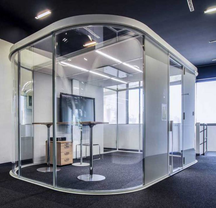 Arredo per ufficio Chakra, Universal Selecta. Design: Eugenio Pasta - R&D Universal Selecta. Dalla motivazione della giuria: “Sistema avanzato di protezione termica e acusti-ca, non privo di eleganza e trasparenza. Separare senza escludere.”
