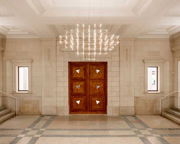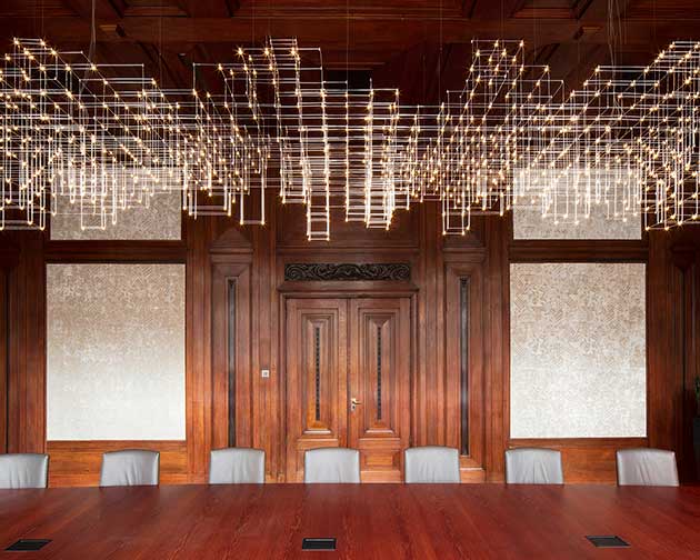 ambienti interni conservati con l’integrazione di elementi illuminotecnici contemporanei. Sotto, il sistema di illuminazione progettato per la grande sala ministeriale (foto ©Karin Borghouts) |