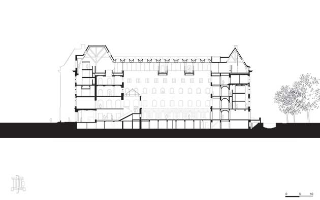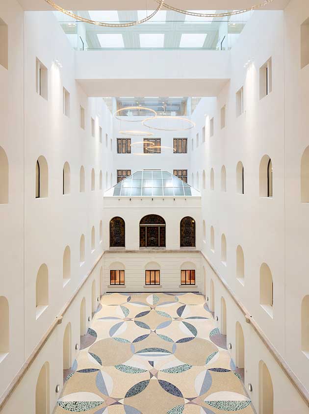 La scala monumentale conduce alla maestosa sala ministeriale al primo piano, mentre l’atrio connette visivamente i quattro piani superiori che ospitano gli uffici delle diverse istituzioni. Un nuovo piano di uffici è situato sopra la navata dell’edificio e si estende fino al tetto, la cui altezza è stata ridotta da 30 a 20 metri per migliorare la scala e le proporzioni del patio interno.