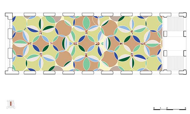 dettaglio e, sotto, disegno del mosaico della pavimentazione a terrazzo dell´atrio nella corte coperta, foto ©Karin Borghouts, disegno Rob Birza |