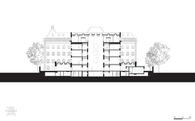 La facciata delle nuove integrazioni consiste in una struttura di cemento sabbiato riempito di pietra e un agente colorante che richiama la tonalità originale dell’edificio. Il cambio nelle relazioni gerarchiche e l’importanza del piano terra si traducono in facciata nell’aumento della dimensione delle vetrate: le aperture raggiungono lo zoccolo di pietra dell’edificio, permettendo di abbassare i davanzali delle finestre e di allungare gli stipiti.