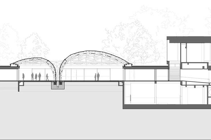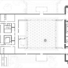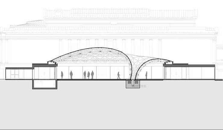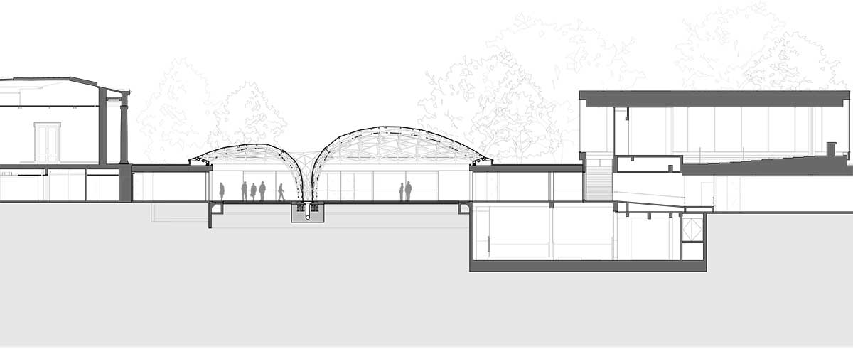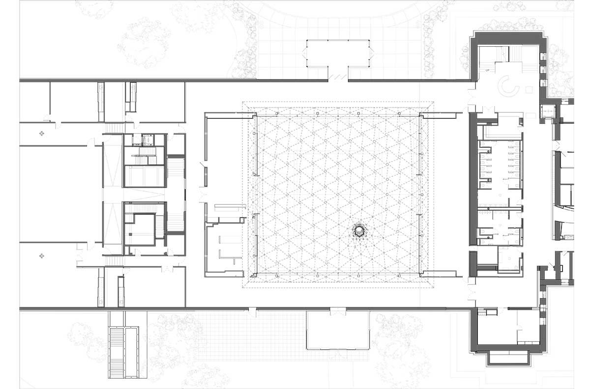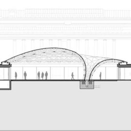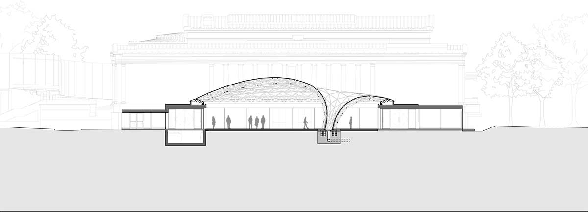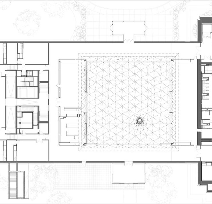 La geometria della cupola forma una traiettoria che attraversa il cortile e passa da motivi triangolari ai bordi a un motivo esagonale al centro. In sezione, la struttura è formata da due livelli di superfici speculari alternate, con il vantaggio di riflettere la luce del sole riducendo l’approto solare all’interno. Verso il centro – esattamente come fece Massimiliano Fuksas – la struttura da poi vita a un ‘vortice’, una sorta di imbuto che si incunea fino a toccare terra portando all’interno elementi esterni, pioggia, neve, foglie o semplicemente luce.