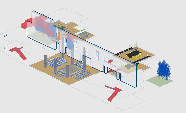 Durante l’indagine del sito, gli architetti di y.ad studio sono stati colpiti dall’armoniosa fusione tra spazi interni ed esterni, architettura e natura. Di conseguenza, il team ha deciso di mantenere il più possibile la forma originale dell’edificio, concentrandosi sullo spazio esistente dell’atrio che confonde i confini tra interno ed esterno.