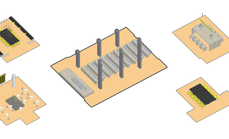 Il progetto quindi valorizza i materiali preesistenti: cemento, pavimentazione a ‘terrazzo’, legno di quercia, e aggiunge l’alluminio perforato utilizzato per i pannelli fonoassorbenti nella zona ristorazione.