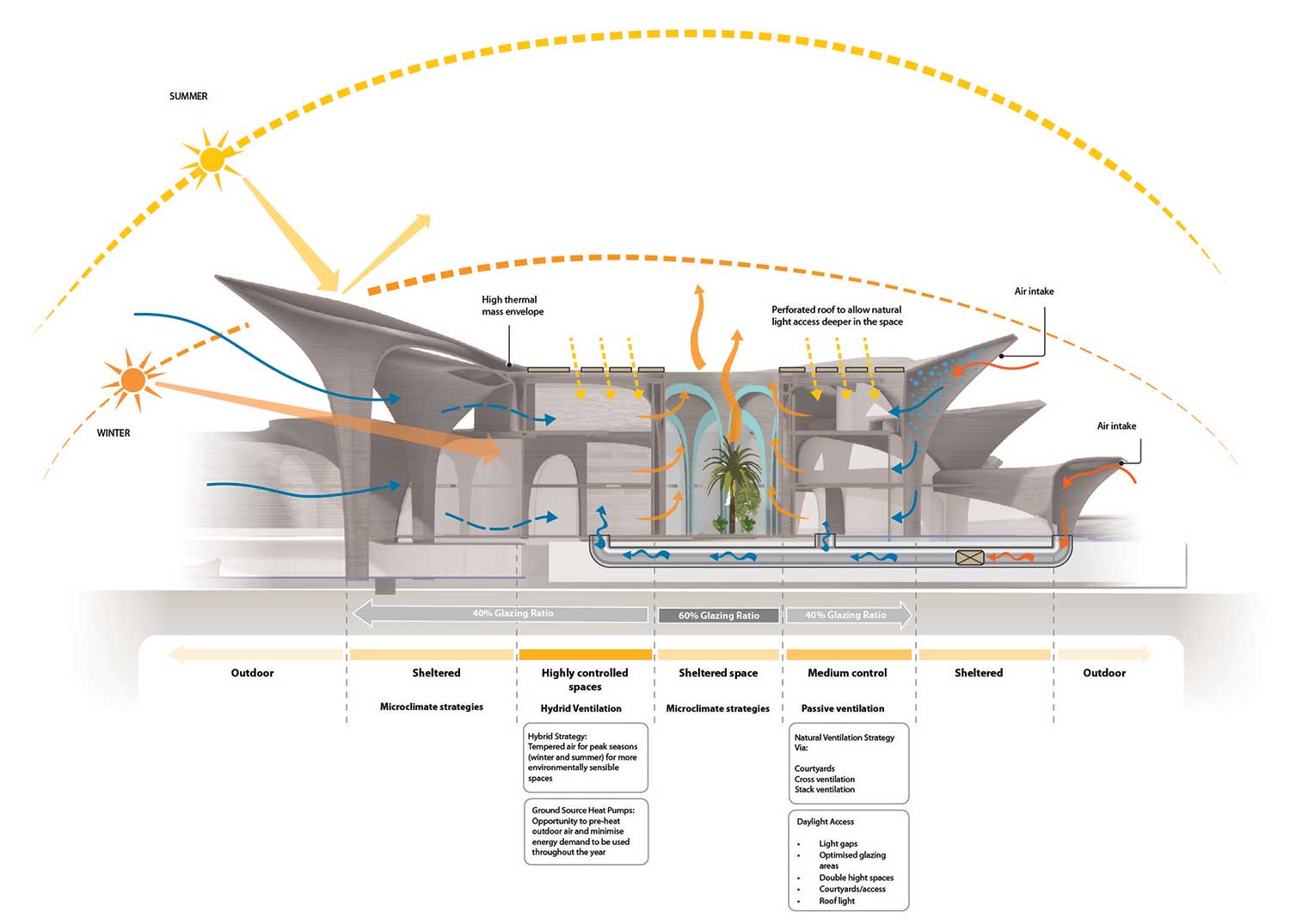 In assenza di vento, le geometrie ad arco delle torri creano inoltre un differenziale di pressione che estrae l’aria calda dal basso e la porta verso l’esterno, contribuendo al raffrescamento.
