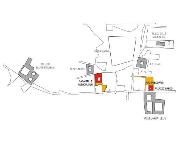 Il progetto Palermo – Al-halisah interviene sul quartiere della Kalsa (in arabo Al-halisah, l´eletta) esaltando l’essenza plurima e stratificata di Palermo. Cuore del quartiere è Piazza Marina con il giardino disegnato da G. B. Filippo Basile che ospita esemplari di Ficus magnolideum tra i più antichi d’Europa. In quest’area ricca di storia insistono alcune tra le principali istituzioni culturali cittadine: Palazzo Abatellis, il Complesso dello Steri, la Galleria d’Arte Moderna, il Museo delle Marionette, il Complesso Monumentale dello Spasimo e il Teatro Libero. Permangono tuttavia molti edifici abbandonati e vuoti urbani che rappresentano un’occasione per ripensare la città consolidata proponendo nuovi spazi per la cultura. Partendo dal recupero di Palazzo Greco, Piazza Scopari e Palazzo Sammartino, il progetto determina un “dispositivo di rigenerazione urbana” e definisce un sistema di piazze, giardini e spazi per la cultura e la ricettività. Su Via Alloro, di fronte a Palazzo Abatellis, il primo stralcio dell’intervento è costituito dal restauro di Palazzo Greco e dal ridisegno del piano di Piazza Scopari, un vuoto urbano determinato dal bombardamento di una parte dell’edificio nobiliare che offre una visione sullo stereometrico volume dello Steri e su Piazza Marina.