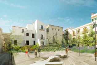 A destra, Piazza Scopari con il retro di Palazzo Greco oggi; a sinistra, render che mostra com´è stata riprogettata (©Archivio AutonomeForme Architects and Landscape Designers)