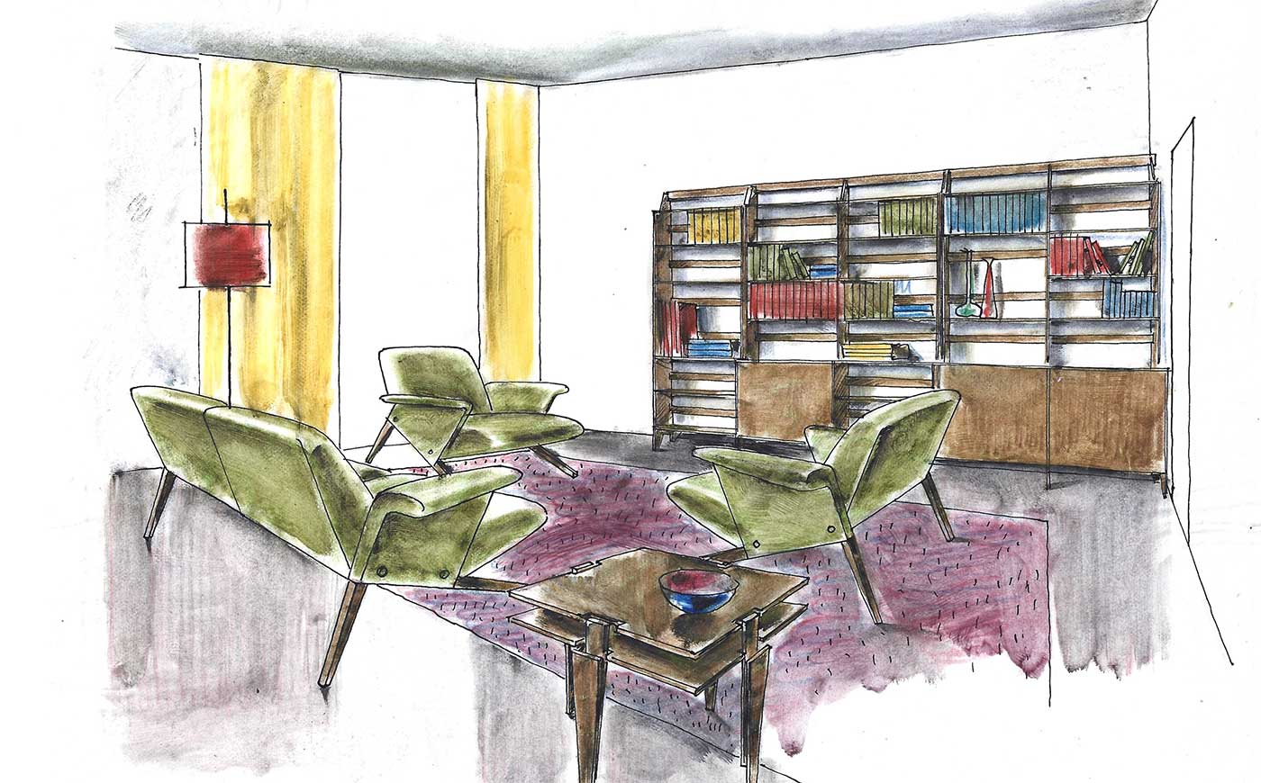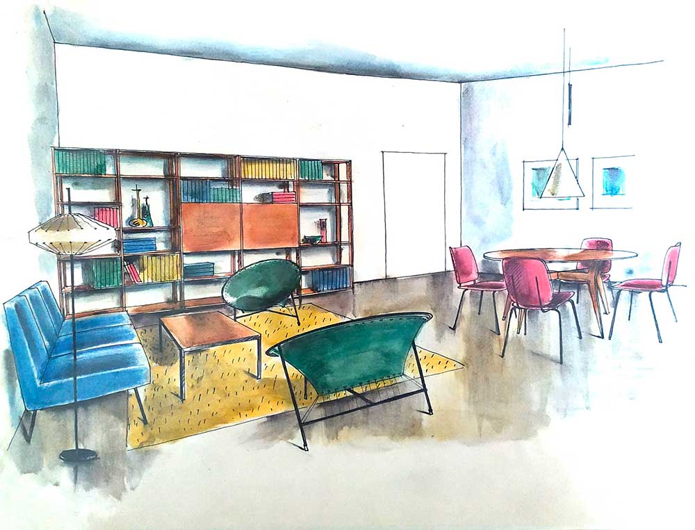 Il percorso si conclude con una selezione di schizzi ambientali, esemplificativi del processo progettuale integrato che caratterizzava l’approccio di Forti.