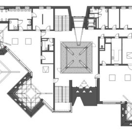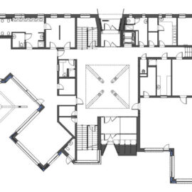Ciascuno dei blocchi colorati ospita un’aula, mentre il resto delle strutture è contenuto nel cubo bianco principale. Dall’atrio si diramano le aule, collegate al giardino e sormontate da lucernari di forma quadrata.