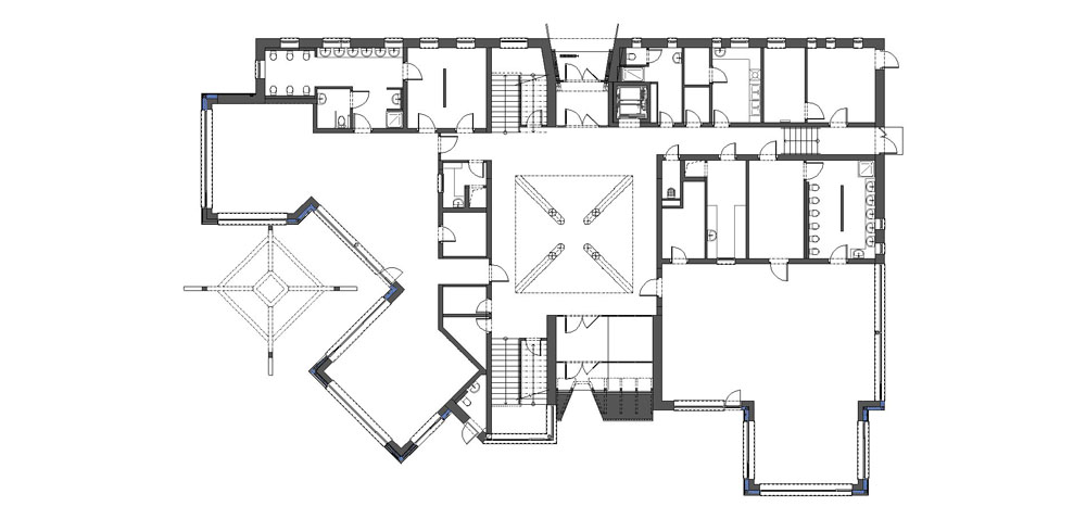 Ciascuno dei blocchi colorati ospita un’aula, mentre il resto delle strutture è contenuto nel cubo bianco principale. Dall’atrio si diramano le aule, collegate al giardino e sormontate da lucernari di forma quadrata.