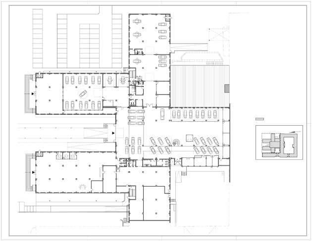 Il progetto architettonico di ristrutturazione ha mantenuto intatto il carattere originario dell’involucro edilizio. Sono quindi state conservate le proporzioni della struttura del complesso, le aperture per le finestre e la muratura esterna in clinker con fughe chiare, rendendo volutamente riconoscibili le nuove installazioni integrate come aggiunte posteriori. Le costruzioni in legno del tetto sono state sostituite con capriate reticolari in acciaio a vista che attraversano l’intera struttura. I sei edifici rimanenti, aventi una superficie totale di 18.000 mq e ordinati in ordine alfabetico dalla A alla F, sono stati destinati a diverse funzioni. Gli edifici A e B sono stati presi in affitto dalla filiale principale della Harley Davidson di Bielefeld, mentre il capannone F è divenuto il cuore dell´intera area, con le sue ampie superfici utilizzate come location per la presentazione di auto d’epoca. Adiacenti all’area di esposizione sono state realizzate le officine meccaniche, un bistrò e uno shop-center per i visitatori, mentre un garage interrato offre riparo a più di 100 automobili e collega i tre edifici.