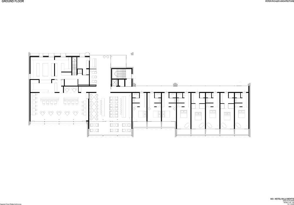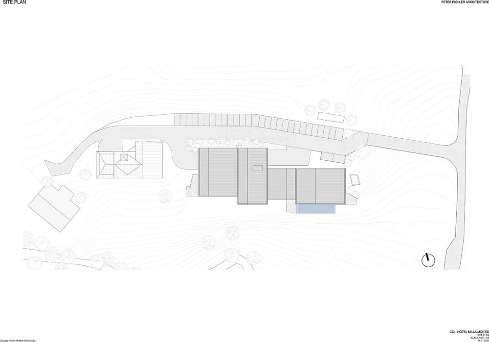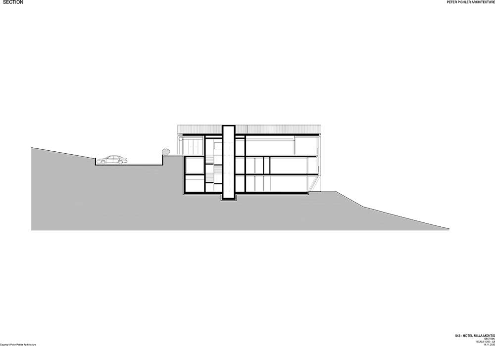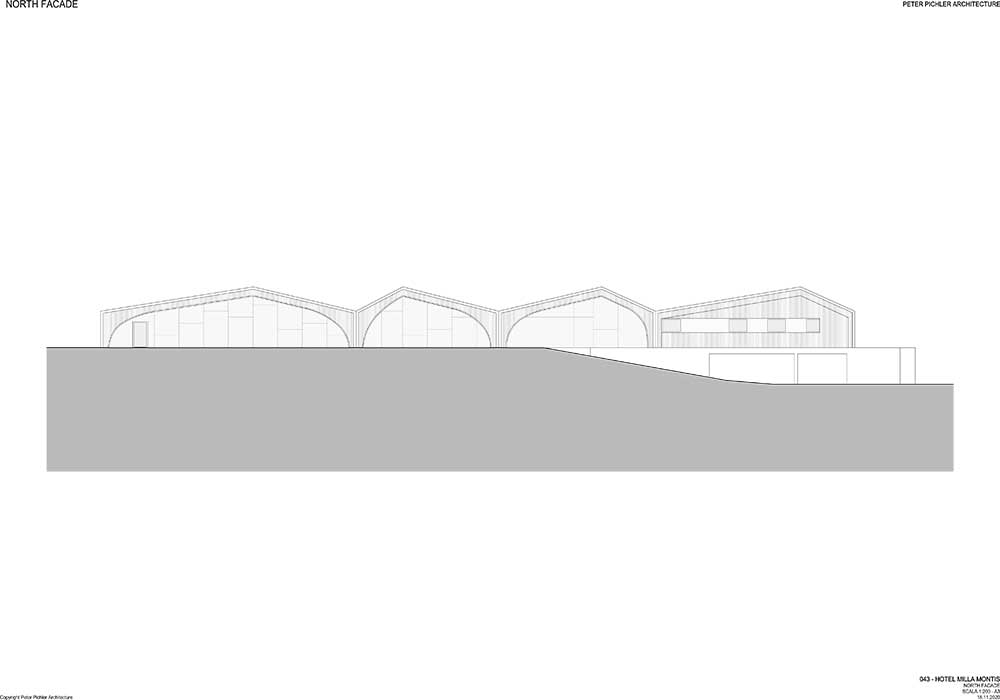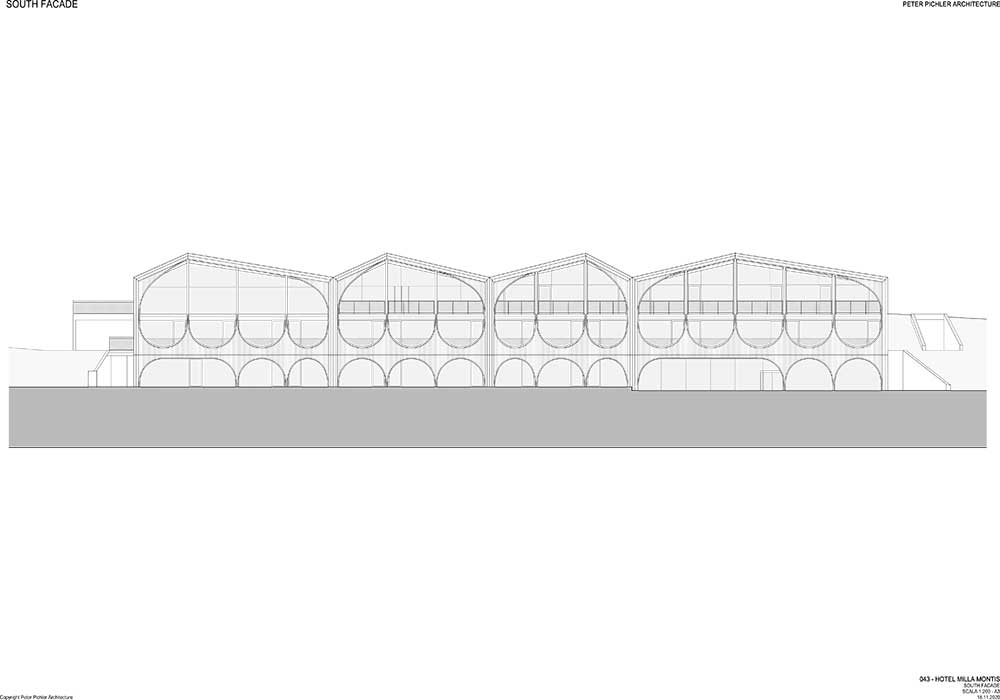 La proposta di Peter Pichler ha immaginato il Milla Montis basandosi sul design dei tetti delle case vicine e delle cime delle montagne, come una forma tonda, anche se vi sono spigoli e angoli. La struttura alberghiera è stata frammentata in quattro volumi sfalsati scomponendone la scala: soluzione progettuale che riduce l’impatto visivo del complesso e rispetta gli edifici circostanti.