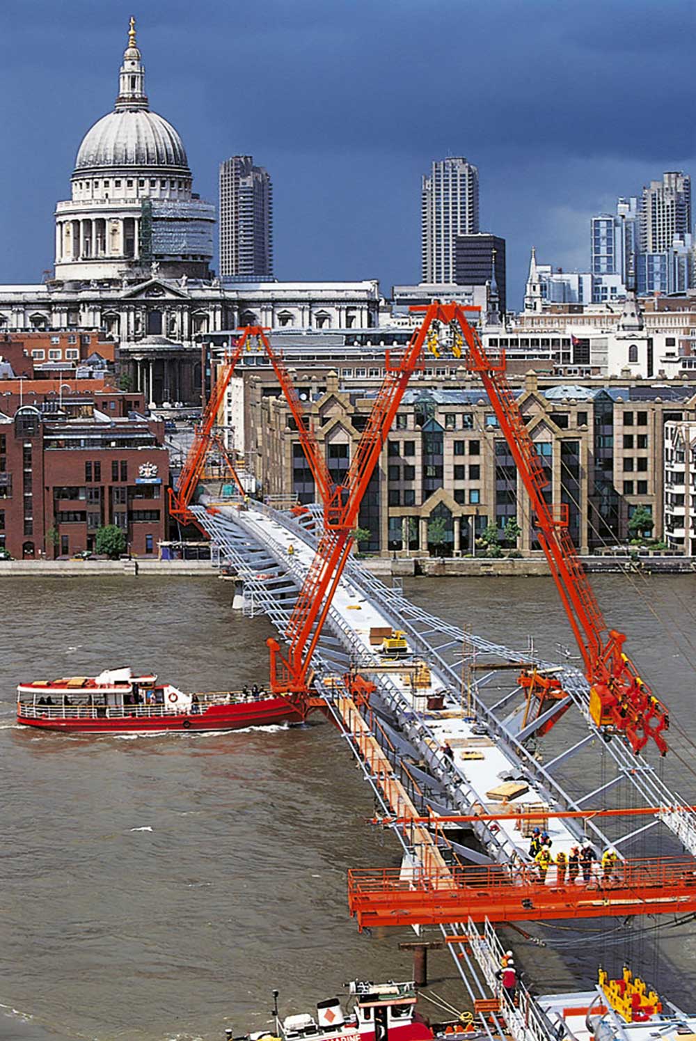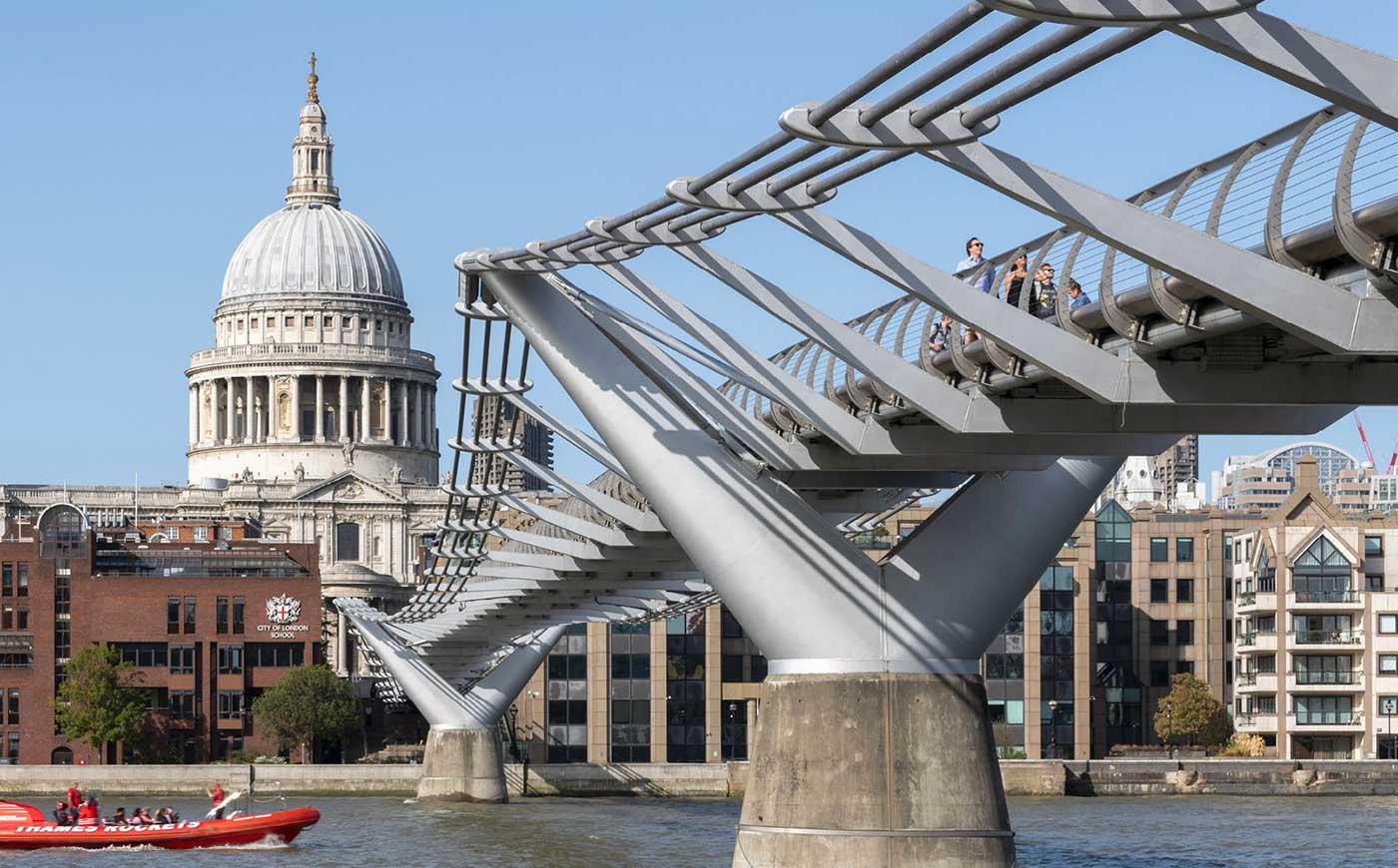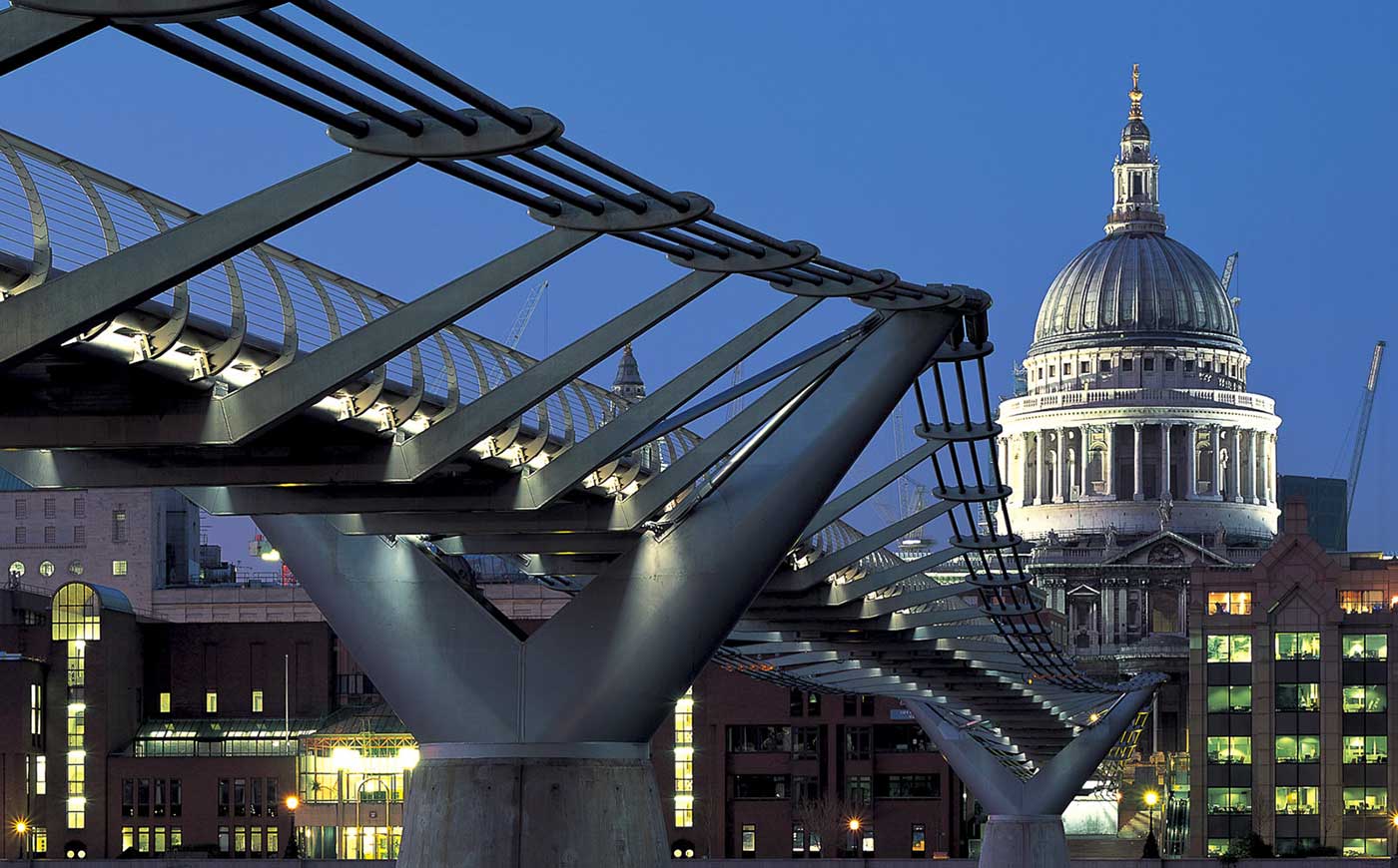 Attraversare il Tamigi dalla City per raggiungere la Tate Modern e la ricostruzione del Globe Theatre shakesperiano è ancor oggi emozionante, anche se non come il giorno dell’inaugurazione, nel giugno del 2000, quando il passaggio contemporaneo di più di duemila persone provocò oscillazioni dell’impalcato che portarono all’immediata chiusura del Millennium Bridge, riaperto solo nel 2002 dopo l’installazione di smorzatori inerziali e idraulici.