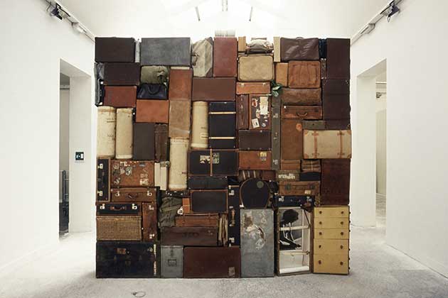 L’installazione è un muro di quattro metri, formato da un cumulo di valigie e bauli accatastati in modo ordinato, di differenti dimensioni e materiali (legno, cuoio, tela).