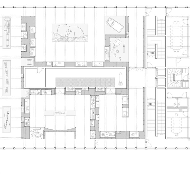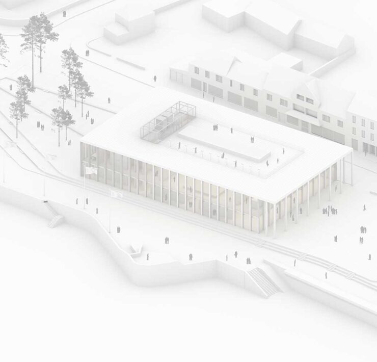 Gli ambienti interni, che si sviluppano per l’intera lunghezza dell’edificio, incoraggiano a visitatori a camminare lungo il perimetro, con viste continue sulla piazza o sull’acqua.