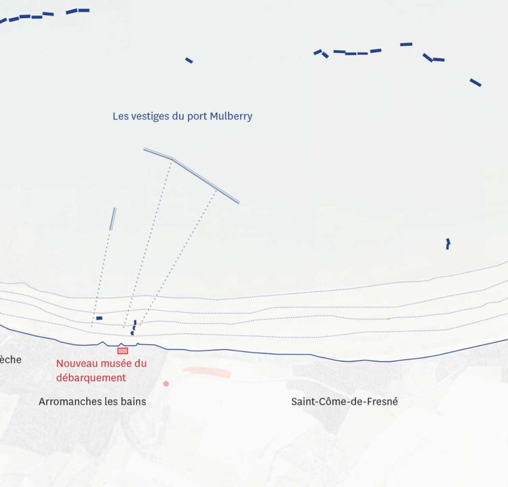 Qui, in cento giorni, su banchine galleggianti protette da una rada di cassoni in cemento dei quali restano le vestigia, sbarcarono 400.000 soldati, 4 milioni di tonnellate di materiale e 500.000 veicoli.