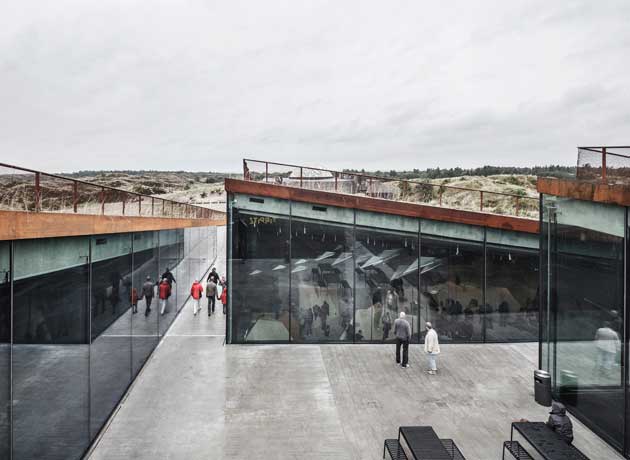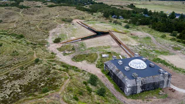 Quattro precisi tagli ortogonali nelle dune di sabbia che convergono verso una corte luminosa, estensione invisibile di 2.800 mq e nuovo centro di attrazione del museo Tirpitz, realizzato anni fa all’interno di uno dei bunker del Vallo Atlantico, l’inutile linea di difesa costruita dal III Reich lungo le coste dell’Europa occidentale, da Capo Nord al Golfo di Biscaglia.