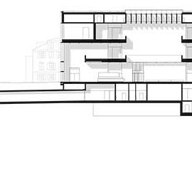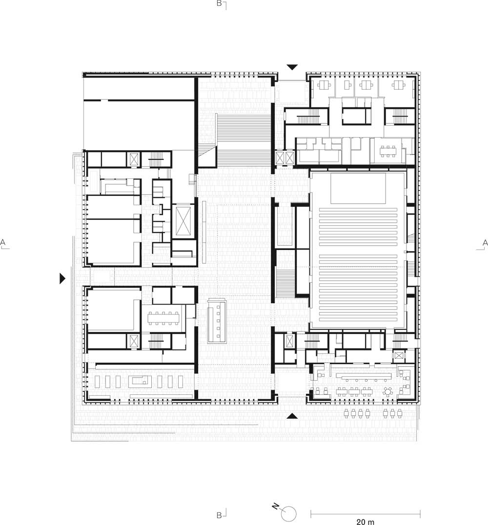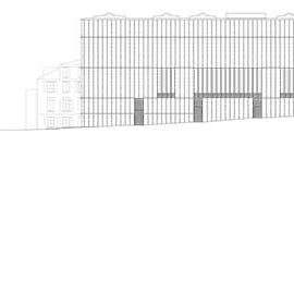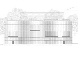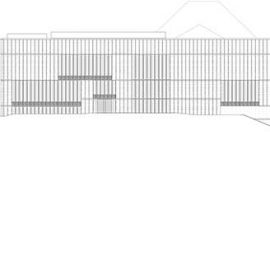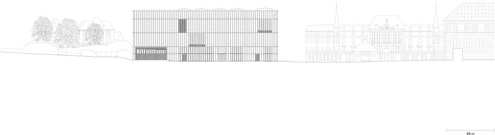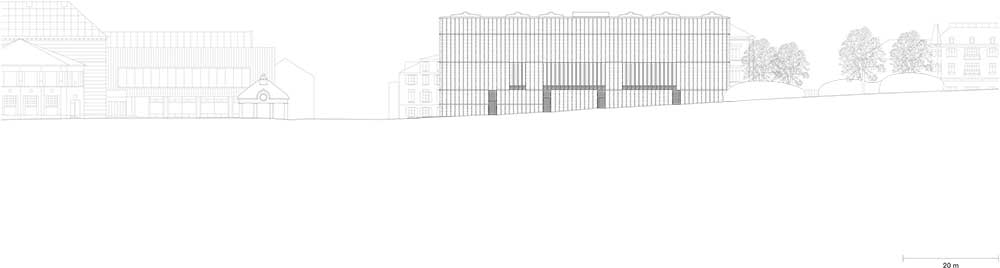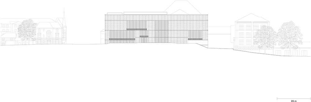 D’altra parte, l’innovazione si esprime nelle esili lame verticali in arenaria locale tagliate a sega che scandiscono la facciata, inserendo in maniera contemporanea l’edificio nel contesto urbano e culturale del luogo.