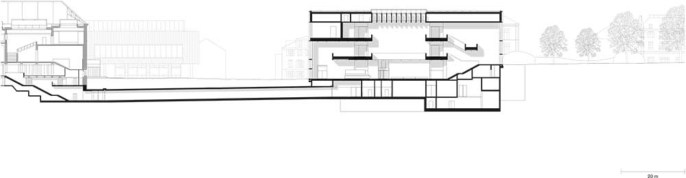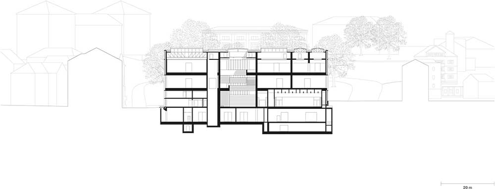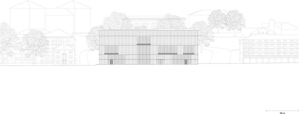 La nuova architettura trae ispirazione dalla vecchia scuola cantonale del 1842 collocata a nord del sito, che con la sua chiarezza architettonica definisce la cornice urbana del perimetro. Il masterplan – approvato nel 2007 – definisce due nuovi spazi pubblici: una piazza urbana verso sud, di fronte al museo esistente e alla Schauspielhaus, e il nuovo Giardino dell’Arte a nord come ambiente aperto e naturale.