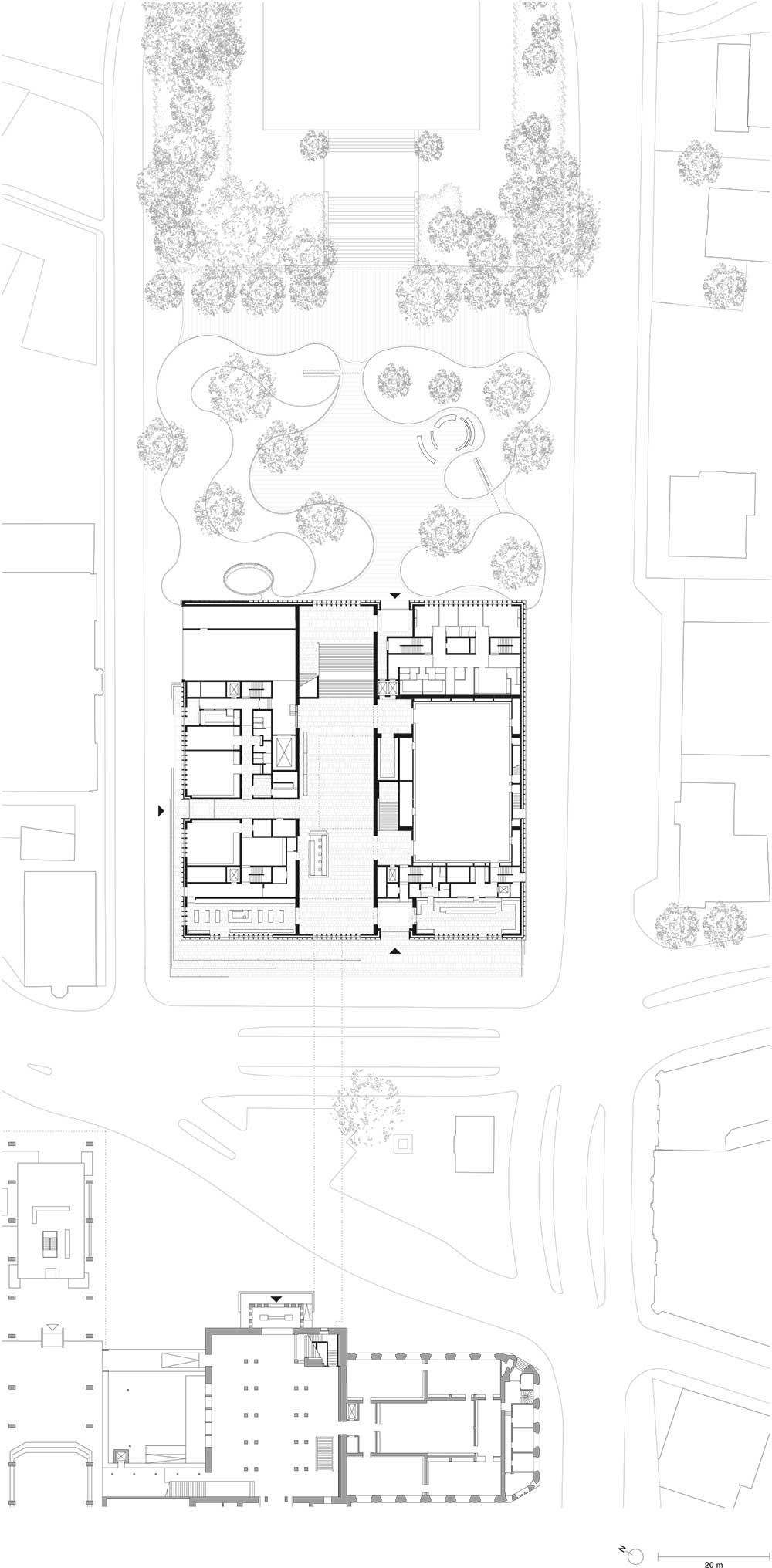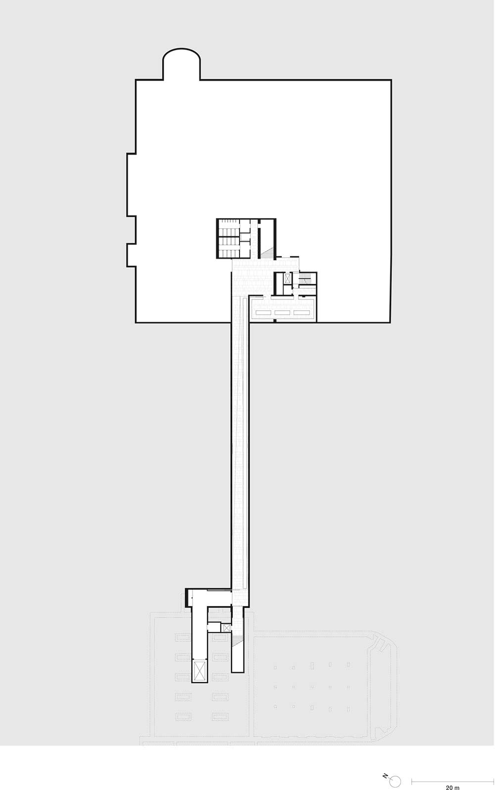 Un percorso sotterraneo aperto ai visitatori collega il nuovo edificio al complesso esistente, dando luogo a un’unica entità museale.
