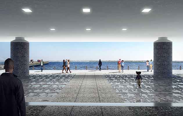 Sul lato est dello spazio, che si affaccia sul porto e sull’Oceano, uno specchio d’acqua riflettente indicherà il punto esatto d’attracco delle navi cariche di schiavi. Su quello opposto la pavimentazione in granito delimiterà lo spazio riparato dedicato a spettacoli e manifestazioni all’aperto.