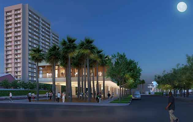 Le lunghe pareti del complesso saranno rivestite in mattoni color giallo pallido, mentre le pareti vetrate, con la vista sull’Atlantico a est e il centro città a ovest, saranno incorniciate dal legno africano in mogano sapele.