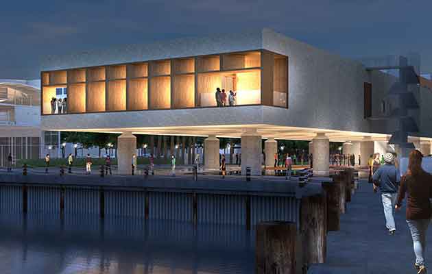 | Render dello Iaam con vista serale dal molo (credits Pei Cobb Freed & Partners)