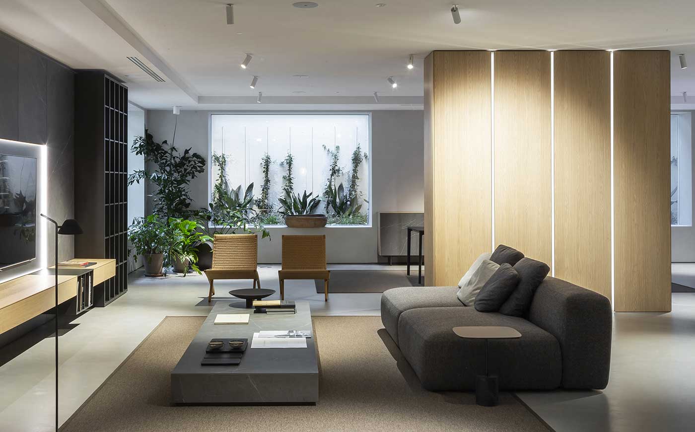 Il layout è stato progettato per soddisfare i diversi tipi di utilizzo dello spazio e per evitare ogni sensazione di chiusura e oppressione derivante dalla natura di piano interrato: ampie vetrate affacciate sul cavedio si aprono su una selezione di piante da esterni; organizzate in isole verdi di differenti altezze, le piante accompagnano anche il percorso interno; l’illuminazione, regolata attentamente nel suo grado di intensità, valorizza le composizioni esposte e aiuta a identificare i punti focali dell’ambiente.