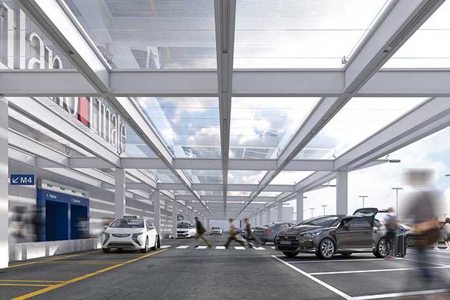 Oggi finalmente si cambia strada. Il progetto prevede la sostituzione della pensilina del livello arrivi con una nuova copertura, ridotta nell’ingombro e in vetro serigrafato, che donerà luminosità all’intero fronte dell’edificio; un nuovo rivestimento bianco – 2.000 mq di facciata ventilata – in Corian; il riposizionamento dell’insegna Milano.Linate che, liberata dalla cartellonistica pubblicitaria dell’intorno, diventerà un elemento chiaro e distintivo dell’aeroporto.