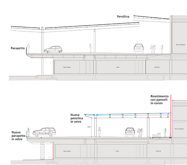 Sezioni a confronto: lo stato attuale e la sezione di progetto che mette in evidenza gli interventi messi in atto per dare pulizia e luminosità all´edificio (©Studio Cerri & Associati) |