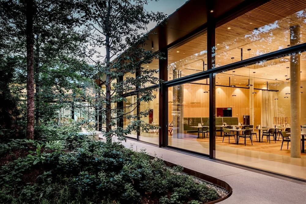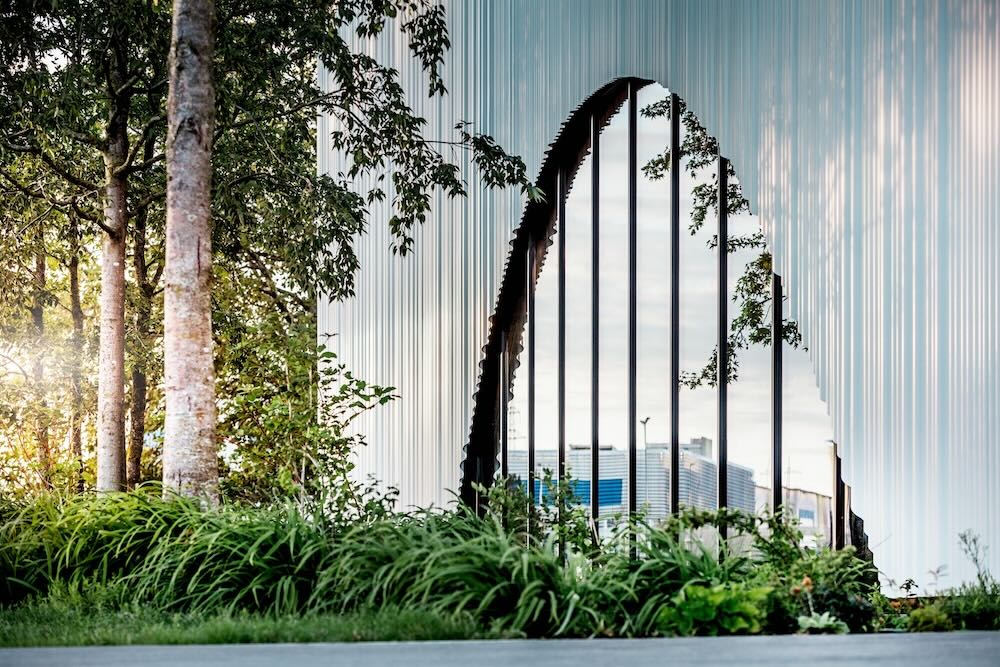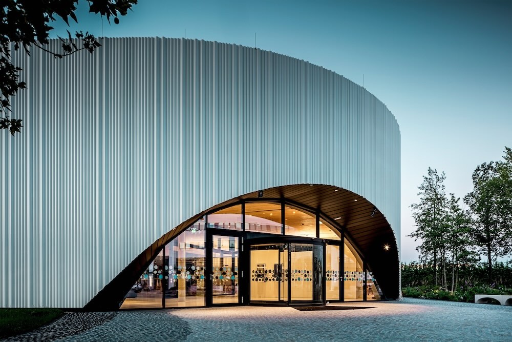 La pianta dell’edificio, un poligono con angoli arrotondati, ha guidato la costruzione di un involucro dall’andamento fluido, che produce un effetto ottico simile a un drappeggio e dà alla superficie un forte carattere plastico. Dietro questa “tenda” architettonica si sviluppano gli spazi interni, orientati verso un atrio di 360 metri quadrati organizzato come un bosco indoor, pensato come luogo di incontro e di sosta.