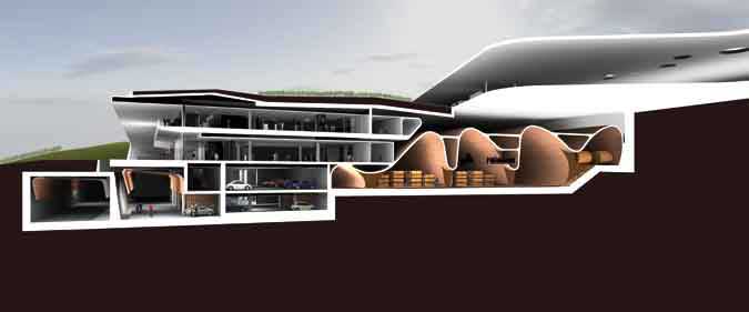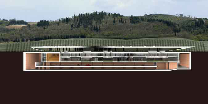 La costruzione concettuale della proposta si traduce in un involucro completamente interrato che ricerca una conciliazione tra naturale e artificiale. Il risultato è un nuovo piano di campagna e un nuovo vigneto segnato da due tagli orizzontali che seguendo le curve di livello muove i profili collinari permettendo l´ingresso della luce nell´edificio e l´inquadramento panoramico del contesto circostante.