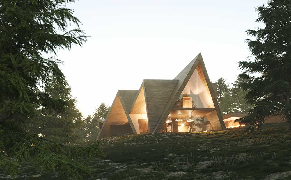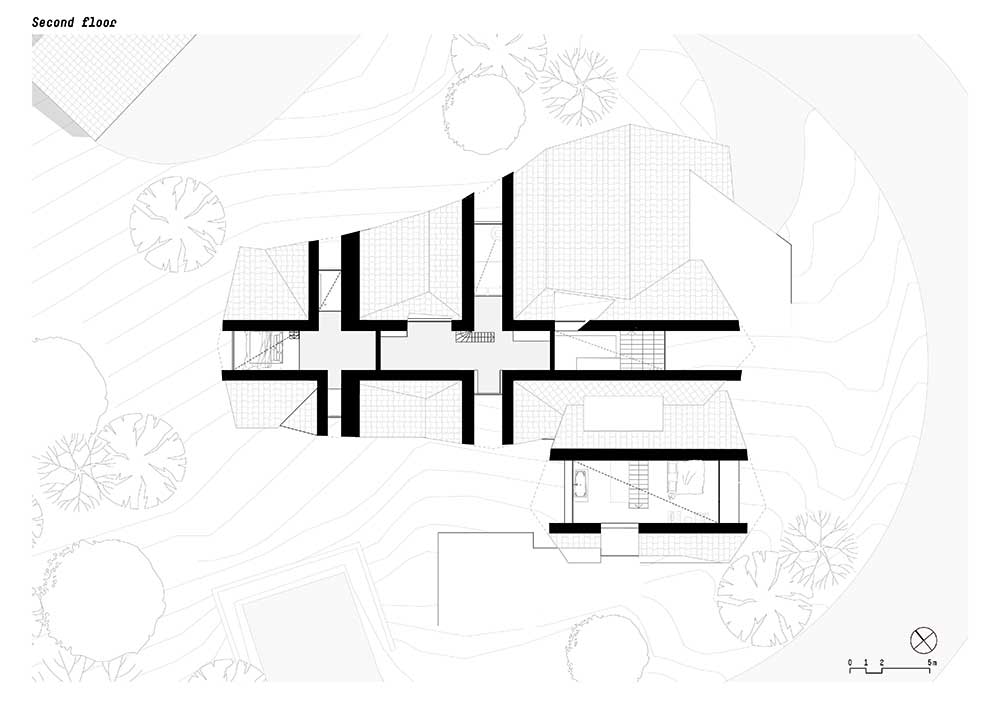 Il risultato è un prisma a sezione triangolare lungo 30 metri che viene intersecato in più punti da volumi dalla stessa geometria. L’architettura, che nella sua articolata volumetria viene percepita come un unico corpo, ospita però una villa privata completamente autonoma per la coppia dei committenti e una family villa dedicata a figli e nipoti.