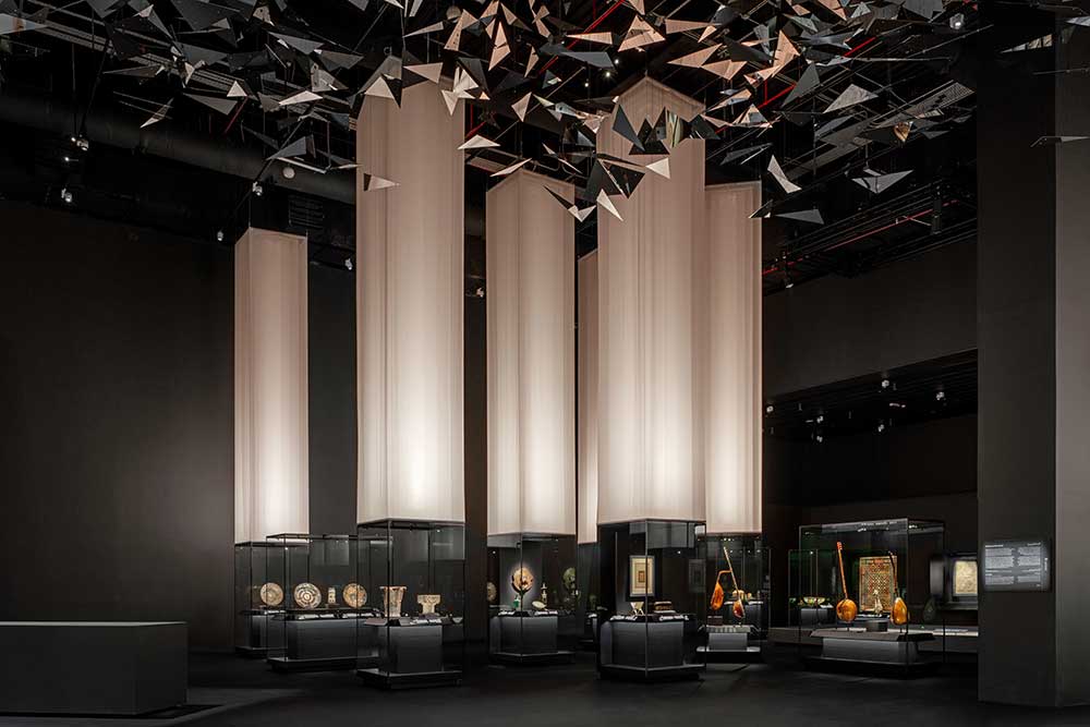 AlMadar (“l’orbita”) presenta una foresta di trentasette colonne rettangolari astratte. Realizzate con strati concentrici di tessuti traslucidi e illuminate dal basso e dall’interno, emergono come estrusioni delle vetrine sottostanti, dissolvendosi gradualmente nell’oscurità del soffitto.