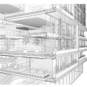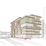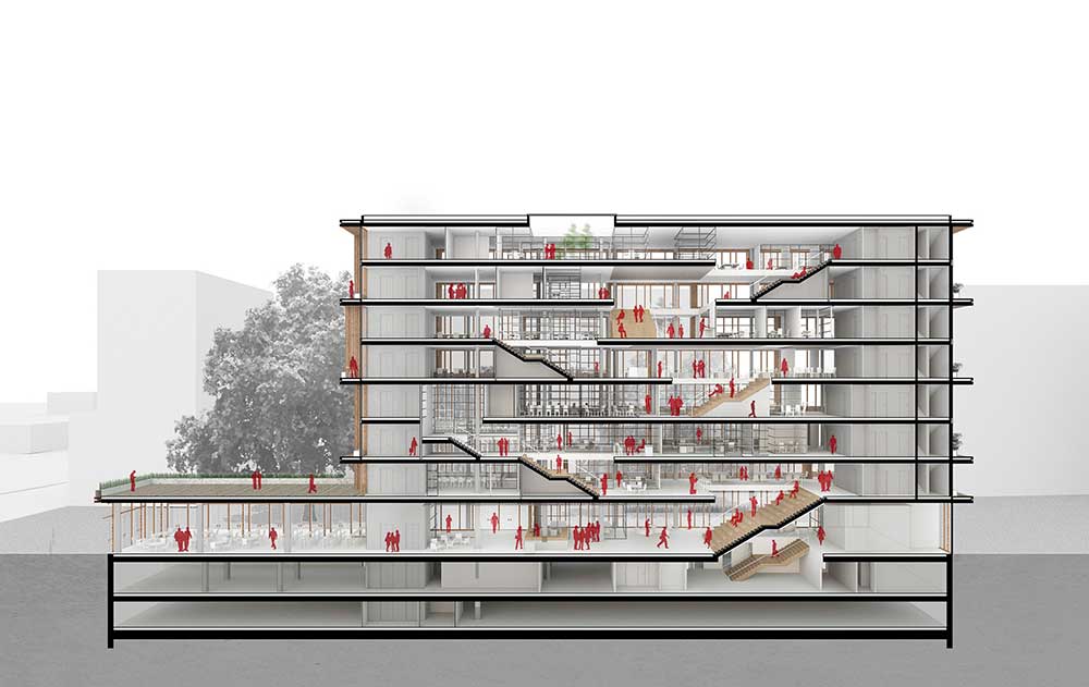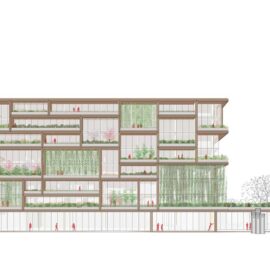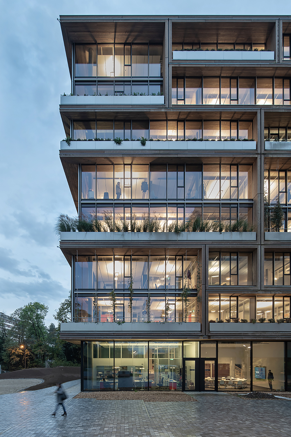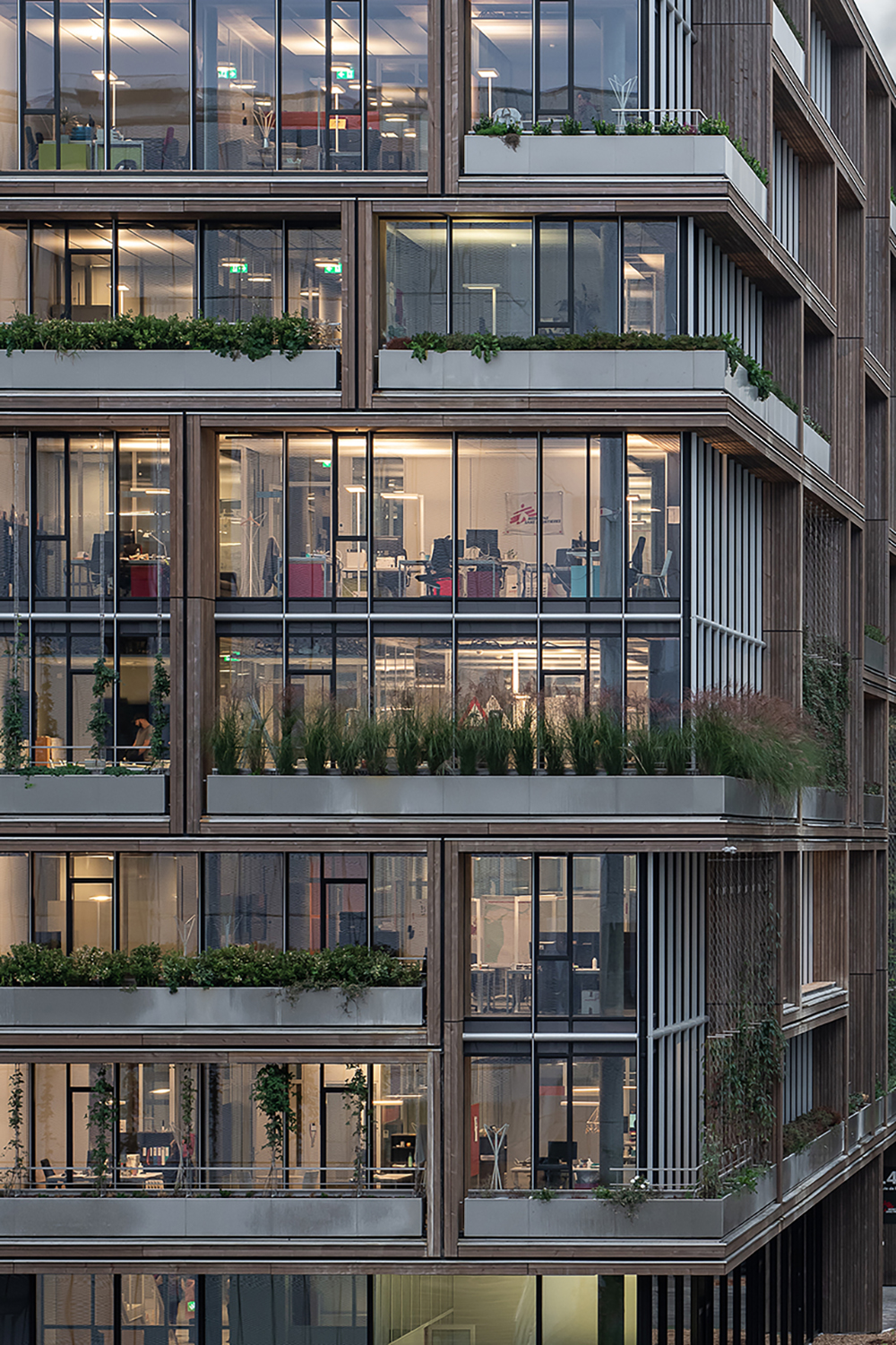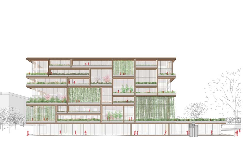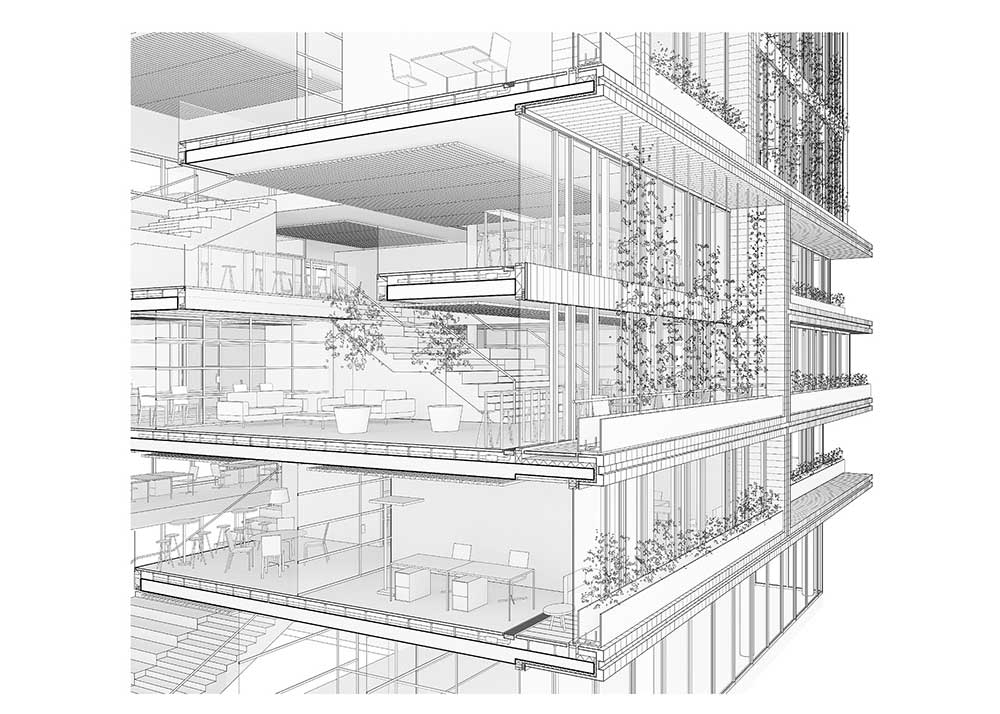 Gli ambienti di lavoro – tradizionalmente interni – si proiettano verso l’esterno con balconi e logge definiti da grandi cornici di legno creando spazi di lavoro alternati tra interno e esterno: una strategia progettuale che partendo da considerazioni sulla qualità di vita degli utenti e assemblando queste cornici come un puzzle gigante definisce le facciate stesse dell’edificio, la loro tridimensionalità e la ricchezza di elementi vegetati, che a loro volta contribuiscono a migliorare il microclima interno e l’impatto generale dell’edificio sulla città.