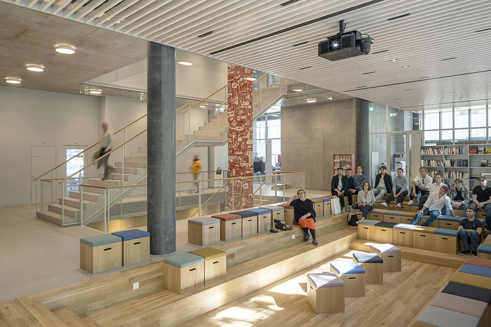 Un’ampia scalinata che attraversa l’intero edificio connette sia visivamente sia dal punto di vista spaziale tutti i diversi ambienti e rafforza la comunicazione tra i dipartimenti dell’organizzazione.