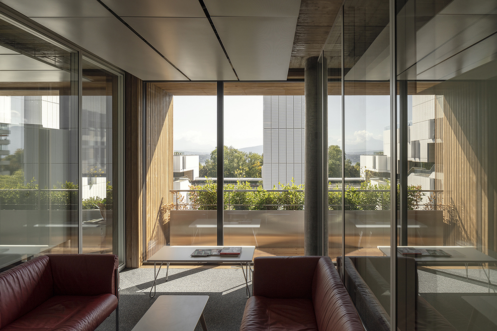 Le strategie ambientali – l’edificio ha raggiunto il massimo punteggio dello standard energetico svizzero ‘Minergie-P’ – includono una tripla vetrazione in facciata, sistemi tessili di ombreggiatura esterna, un parco fotovoltaico in copertura e soprattutto il collegamento con il sistema energetico ‘Genilac’, che utilizza l’acqua del lago di Ginevra e elettricità da sole fonti rinnovabili per il funzionamento delle pompe di calore che provvedono alla climatizzazione invernale e estiva (distribuita mediante pannelli radianti a soffitto).