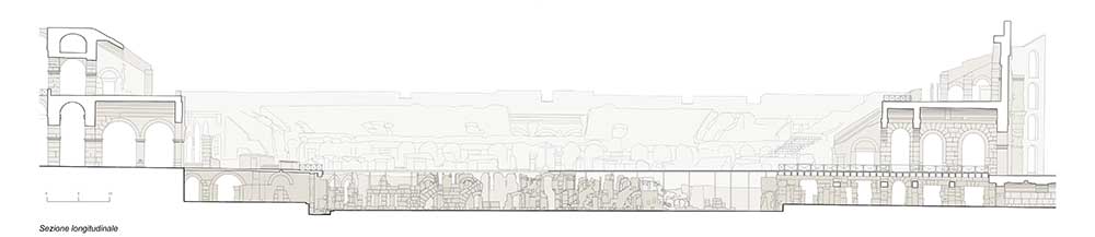 Le sezioni integrate, complanari all’estradosso del nuovo piano dell’arena, riproporranno in maniera idealizzata le strutture archeologiche sottostanti suggerendo, anche nella configurazione del piano completamente chiuso, la continuità di lettura tra le strutture ipogee e la cavea del Colosseo.