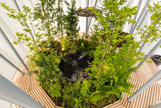 L’installazione è una fitta, umida e profumata foresta. Grazie alla ventilazione e alla tecnologia di vaporizzazione dell’acqua, la temperatura interna percepita si riduce fino a cinque gradi in meno rispetto all’esterno. Un ruolo importante è svolto da muschi, felci e licheni, componenti importanti nell’ecosistema, che neutralizzano l’anidride carbonica e producono ossigeno.