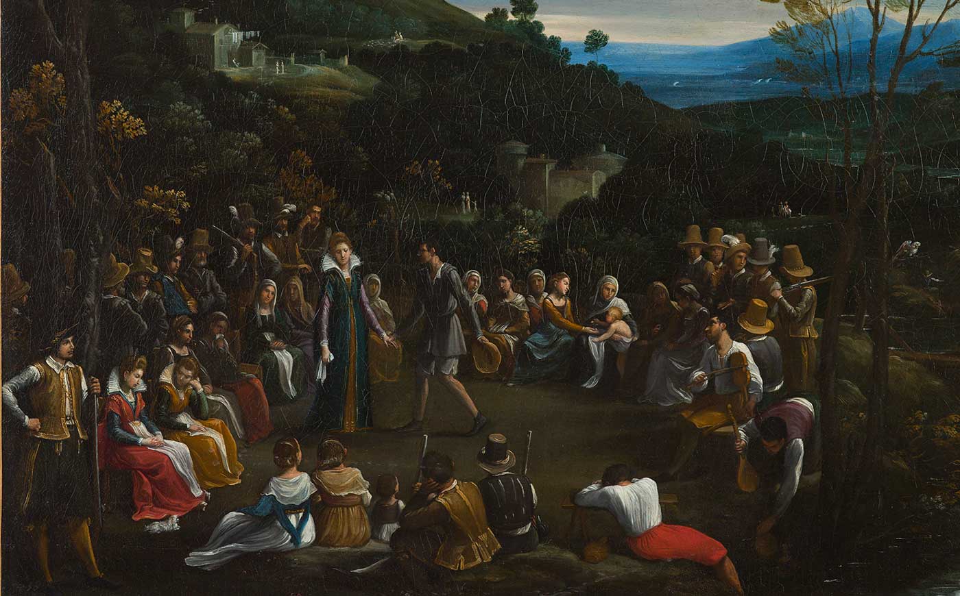 La mostra ruota attorno al ritrovato dipinto Danza campestre (1605 circa), che da un anno è tornato a fare parte della collezione del museo. Appartenente alla collezione del cardinale Scipione Borghese, citato negli antichi inventari sin dall’inizio del Seicento, venduto nell’Ottocento, prima disperso e poi ricomparso nel 2008 sul mercato antiquario londinese come anonimo bolognese, il quadro, dopo le opportune verifiche attributive, è stato riacquistato dalla Galleria nel 2020.