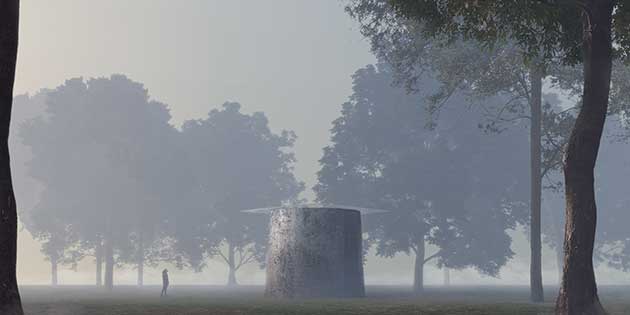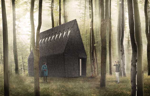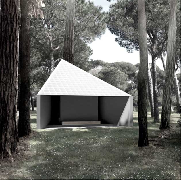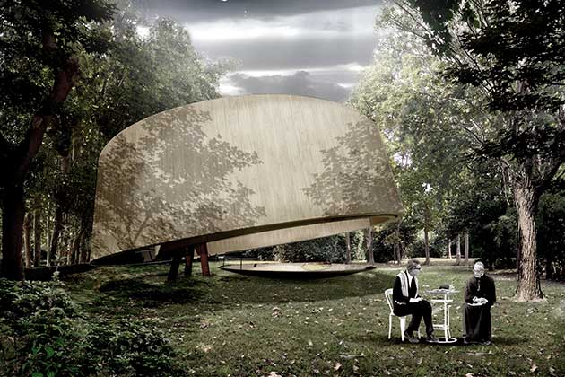 La cappella ´Asplund´, progetto di MAP Studio di Francesco Magnani e Traudy Pelzel, introduce il percorso del padiglione nel bosco della Fondazione Cini. Sarà realizzata con materiali forniti da Alpi.