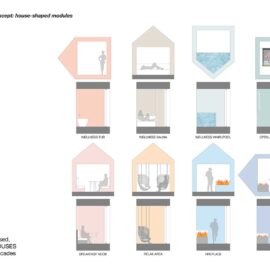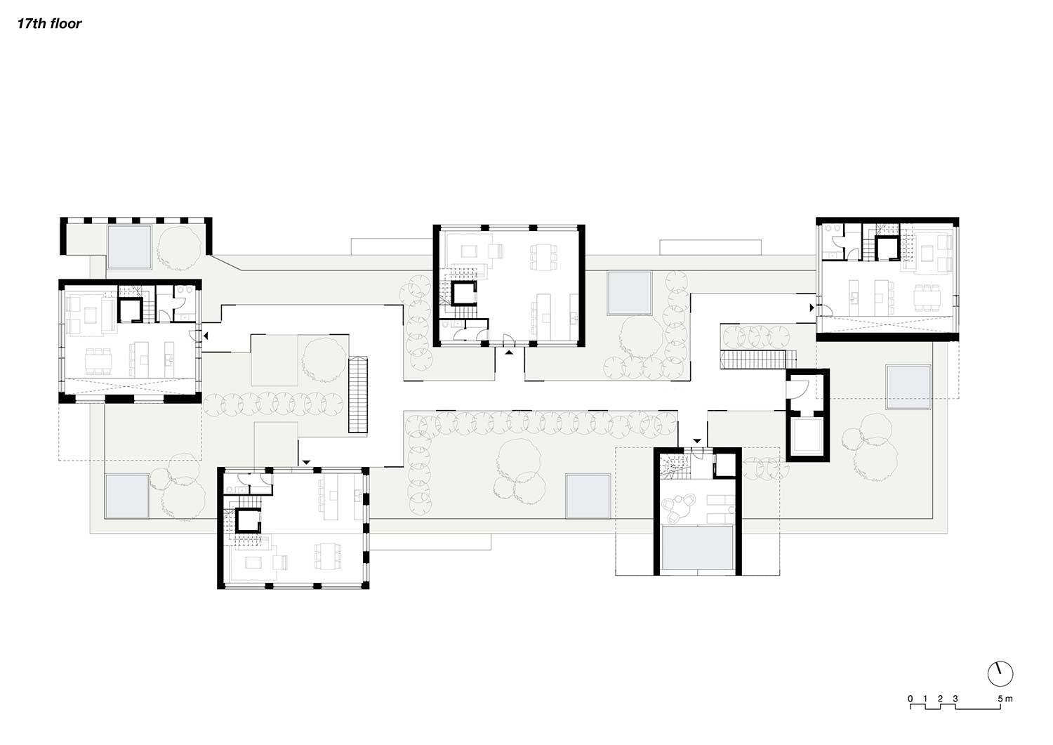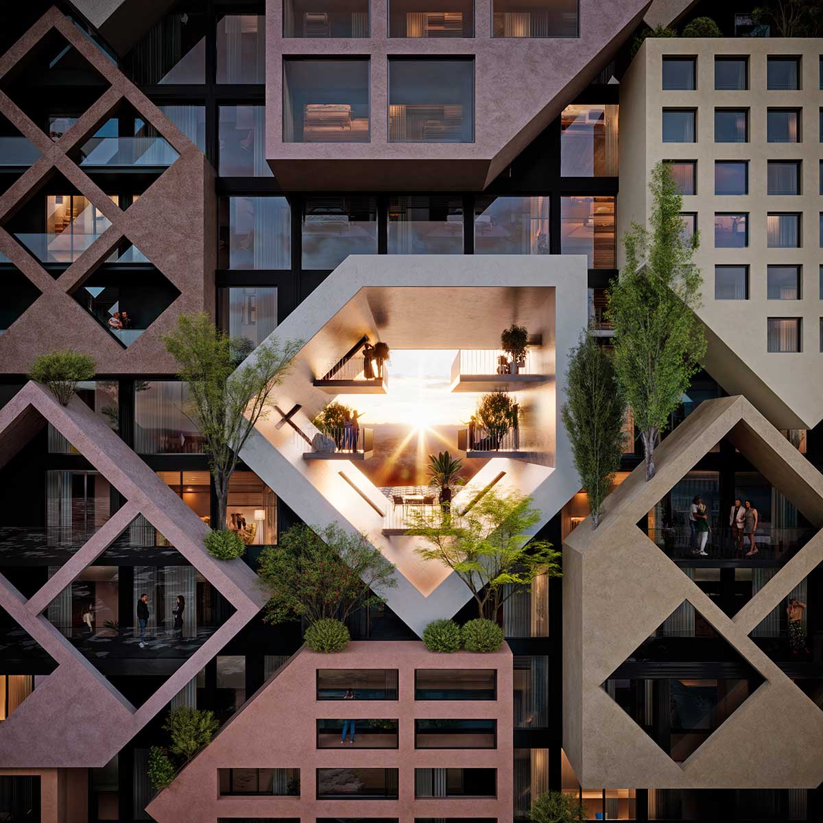 Ma non si tratta di una mera scelta formale: ogni modulo rappresenta uno spazio extra per appartamenti e aree commerciali. È uno spazio ibrido, tra interno ed esterno, che può ospitare funzioni diverse: giardini pensili, logge, cinema all’aperto, vasche, saune, aree bbq.