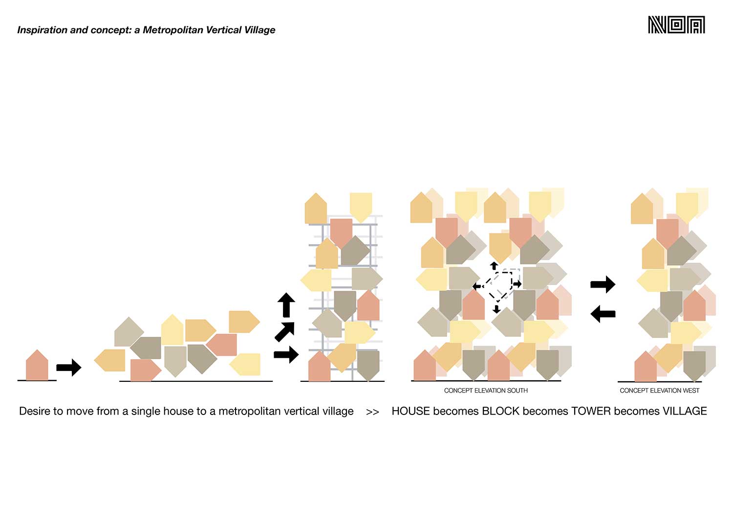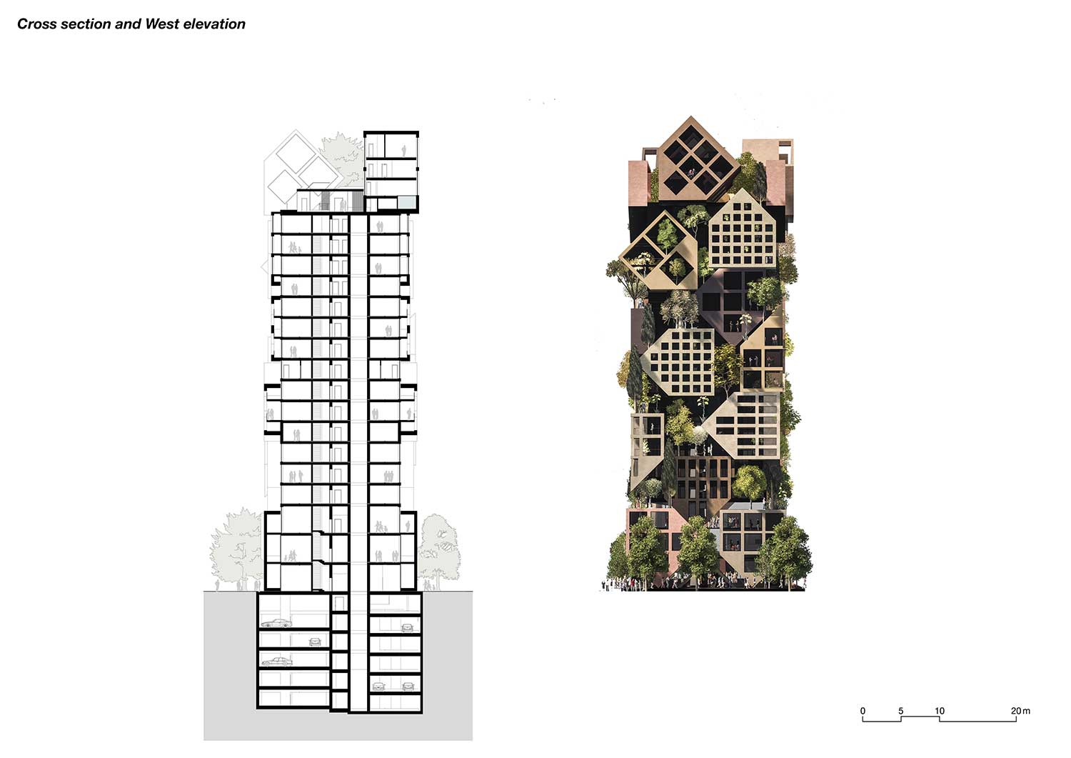 I quattro fronti della futura torre sono caratterizzati da una composizione vivace e diversificata di moduli a forma di casa con tetto a capanna, aggettanti da 0,5 a 3 metri. Realizzati in colorazioni diverse, si differenziano anche per forma, orientamento del tetto, numero e dimensione delle aperture.