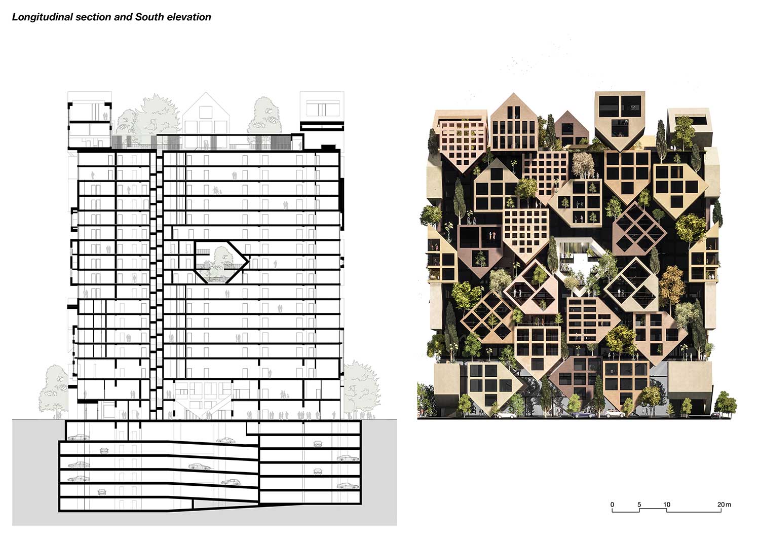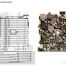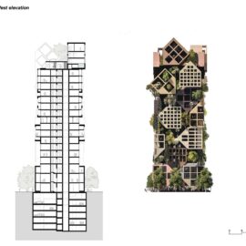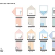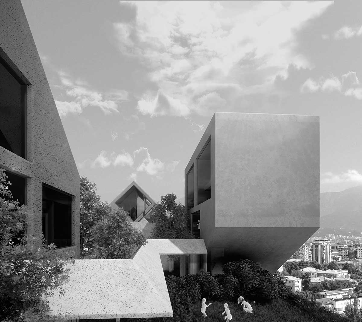 L’originale progetto, che moltiplica e sovrappone in una composizione verticale l’archetipo della casa con tetto a capanna, sorgerà su un lotto rettangolare di 75 x 25 metri, in un’area densamente costruita, dove edifici di dieci piani si alternano ad abitazioni di due o tre livelli, una situazione non insolita a Tirana.