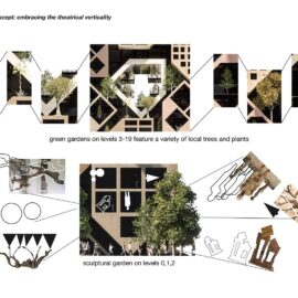 Le facciate sono ulteriormente arricchite dall’innesto, sulle fasce sporgenti dei moduli, di piante e arbusti. Nei primi due piani, questo giardino pensile si completa con opere scultoree, dando vita a un percorso artistico lungo la facciata.