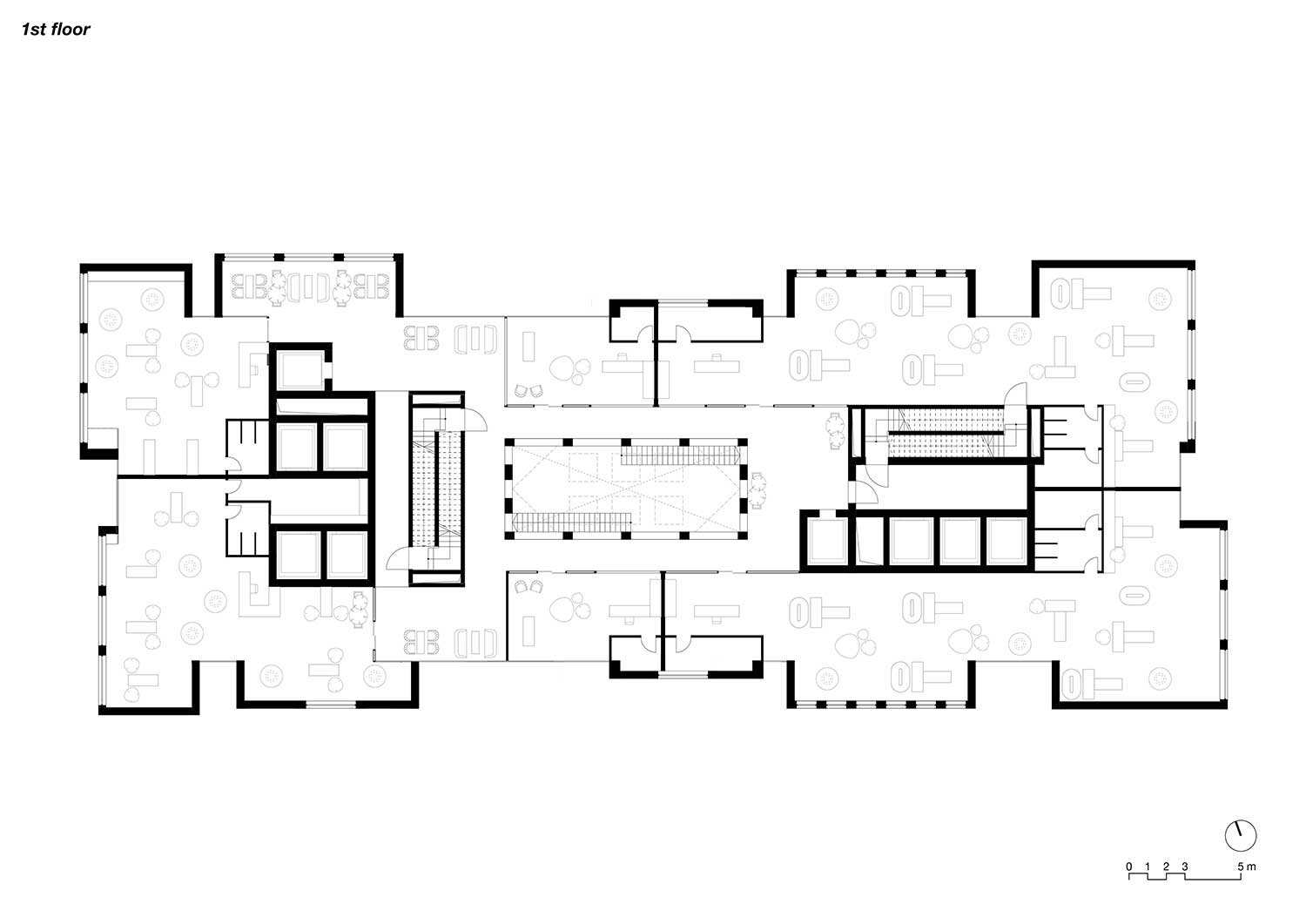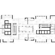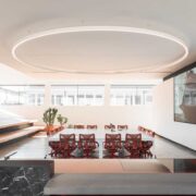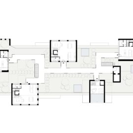 «Gli elementi di facciata si estendono fino all’interno dell’edificio – aggiunge Andrea Dal Negro, architetto che segue il progetto. I fronti della corte interna, che si sviluppa sui primi due piani dedicati all’area commerciale, appaiono anch’essi come case rovesciate che delimitano gli spazi di circolazione».