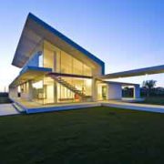 Una consistenza materica che si protrae fin nelle funzioni interne, definite da una topografia scultorea di cemento faccia vista e cinte da una massa muraria spessa e semicieca, che emerge austera dal suolo per sostenere l´involucro del piano superiore.Il movimento centripeto innescato dal vuoto attorno al quale si organizzano gli ambienti interni coinvolge anche questo piano, deformandone l´involucro e trascinando l´intero paesaggio dentro e sopra le abitazioni. Ricoperti dalla vegetazione sia sui tetti che sui fianchi a mezzogiorno, i gusci lignei che alloggiano i piani sopraelevati sono retti da capriate snellissime e dall´apparenza precaria, quasi fossero promenade leggere protette da rigogliosi pergolati. Squarciati da grandi vetrate a nord e a tramonto, i gusci ospitano le funzioni diurne e offrono generose vedute al riparo dalla calura estiva. Collegando il parco antistante ai giardini pensili, la spirale distribuisce le funzioni e le connette a un percorso continuo ed ascendente, offrendo a tutti gli ambienti della casa accesso diretto al giardino. Il percorso si snoda fin sopra gli edifici conducendo ad ammirare il paesaggio dal punto esterno più alto.